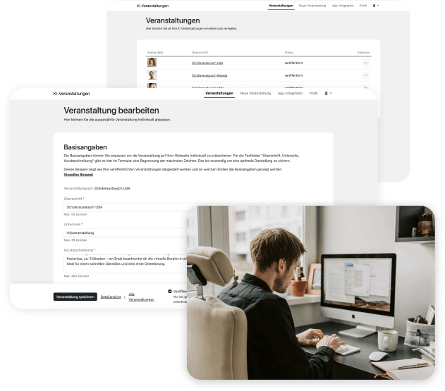 Erstellen und steuern Sie Ihre KI-Infoveranstaltungen im Backend. Die App bringt sie automatisch auf Ihre Website.